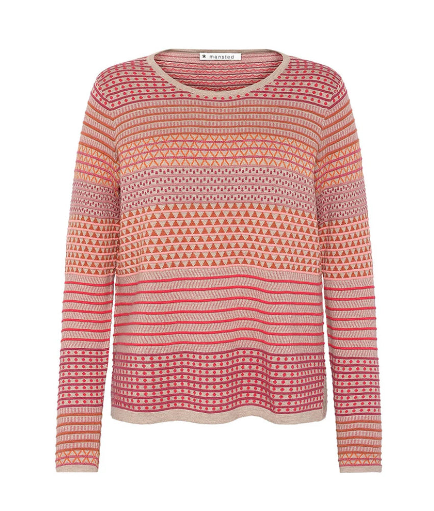 detail : multi coloured floating jacquard pattern and structure mix, the pullover has slits at the side