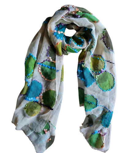 Painted and embroidered scarf aqua circles